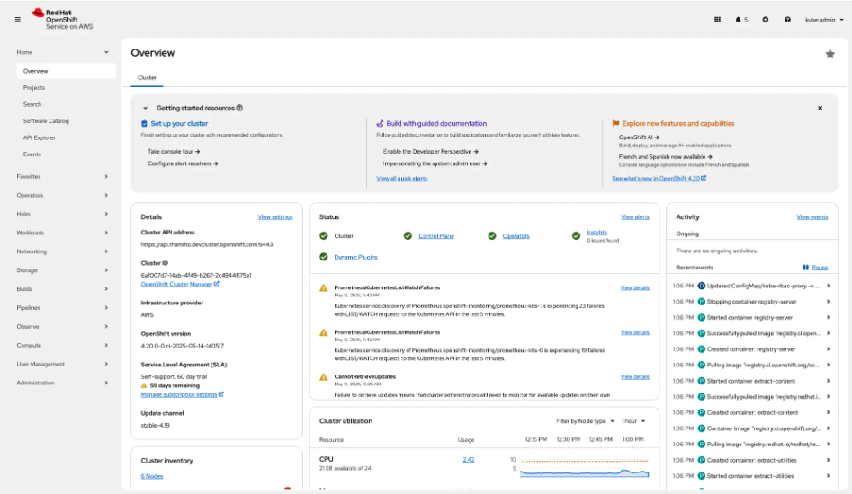 System Overview: Navigate to the main dashboard to view the overall health, capacity, and status of the OpenShift Container Platform cluster, including compute, storage, and networking resources.